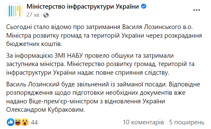 "Сьогодні стало відомо про затримання Василя Лозинського в.о. Міністра розвитку громад та територій України через розкрадання бюджетних коштів. За інформацією ЗМІ НАБУ провело обшуки та затримали заступника міністра. Міністерство розвитку громад, територій та інфраструктури України надає повне сприяння слідству. Василь Лозинский буде звільнений із займаної посади", — йдеться у заяві.