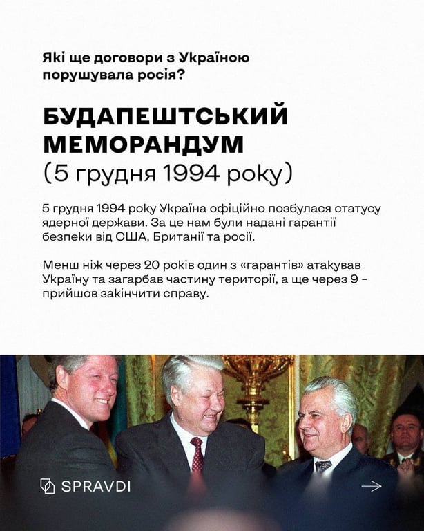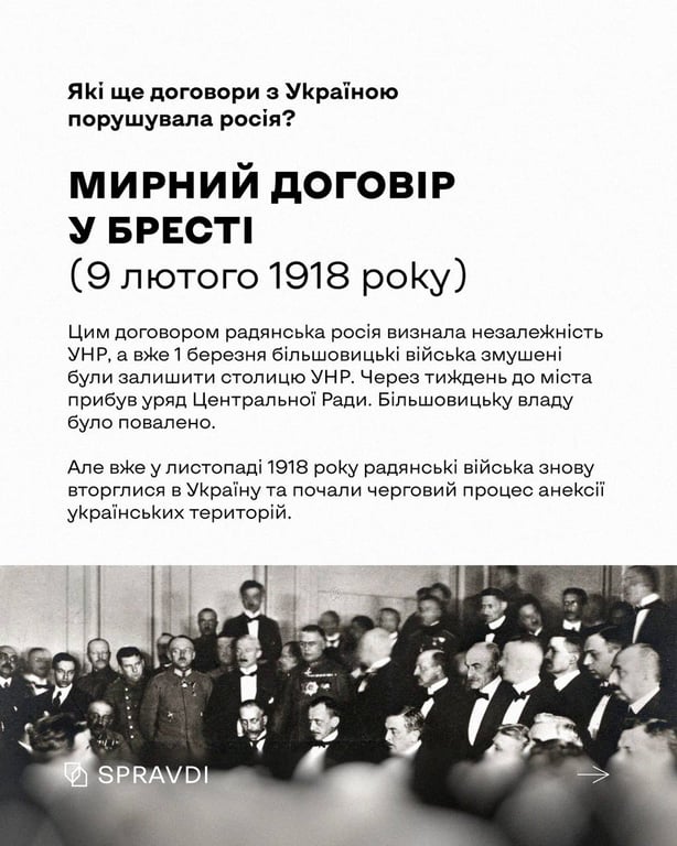 Росіяни безпринципно порушили "Брестські угоди" 1918 року і вторглися в Україну, а своїм порушенням "Будапештських домовленостей" — вчергове плюнули в обличчя Україні та світу. Повномасштабне вторгнення у 2022 році вкотре показало усю цинічність режиму РФ.
