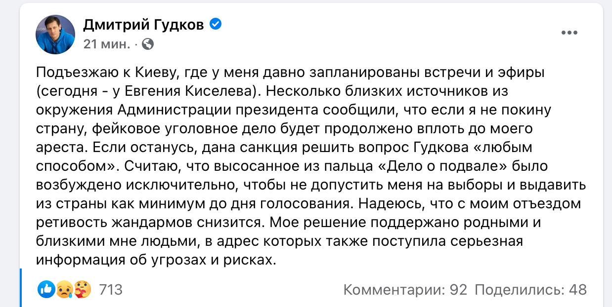 "Під'їжджаю до Києва, де у мене давно заплановані зустрічі та ефіри (сьогодні — у Євгена Кисельова). Кілька близьких джерел з оточення Адміністрації президента повідомили, що якщо я не покину країну, фейкова кримінальна справа буде продовжена аж до мого арешту. Якщо залишуся, дана санкція вирішити питання Гудкова "будь-яким способом". Вважаю, що висмоктана з пальця "Справа про підвал" була порушена виключно, щоб не допустити мене на вибори і видавити з країни як мінімум до дня голосування. Сподіваюся, що з моїм від'їздом завзятість жандармів знизиться", - написав він.