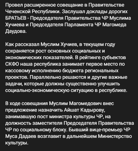 Рамзан Кадыров написал, что на расширенном заседании правительства глава парламента Чечни Муслим Хучиев предложил назначить Айшат Кадырову на должность вице-премьера.