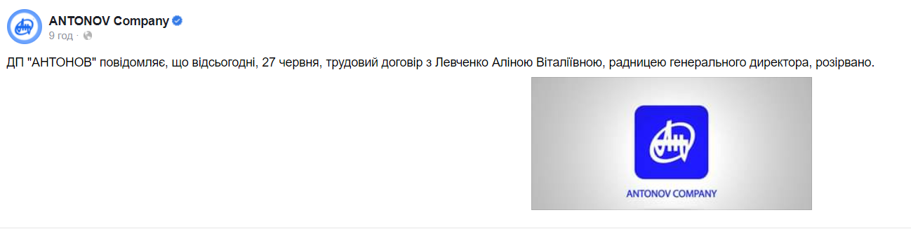 "ГП "Антонов" сообщает, что с сегодняшнего дня, 27 июня, трудовой договор с Левченко Алиной Витальевной, советницей генерального директора, разорван", — говорится в сообщении.