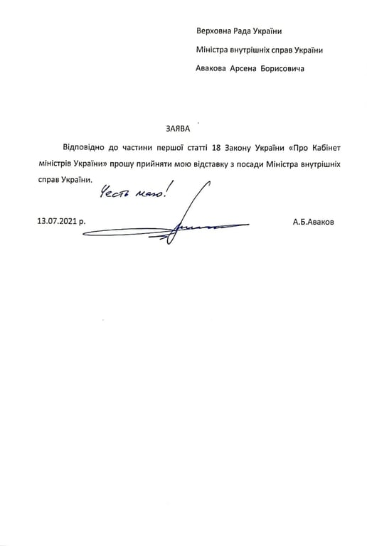 "В соответствии с частью первой статьи 18 Закона Украины “О Кабинете Министров Украины” подал заявление об отставке с должности министра внутренних дел.