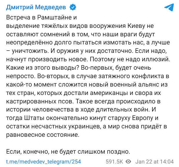 "Встреча в Рамштайне и выделение тяжелых видов вооружения Киеву не оставляют сомнений в том, что наши враги непременно будут долго пытаться вымотать нас, а лучше уничтожить. И оружия у них достаточно. Если надо, начнут делать новое. Поэтому не надо иллюзий", — написал Медведев, подчеркнув, что россии "будет непросто".