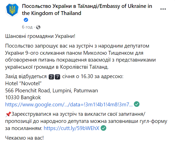 В Посольстве Украины в Таиланде сообщили, что Тищенко проведет встречу, на которой хочет обсудить "вопрос улучшения взаимодействия с представителями украинской общины в Королевстве Таиланд".