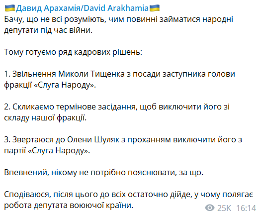 "Вижу, что не все понимают, чем должны заниматься народные депутаты во время войны. Поэтому готовим ряд кадровых решений. 1. Увольнение Николая Тищенко с должности заместителя председателя фракции "Слуга Народа". 2. Созываем срочное заседание, чтобы исключить его из состава нашей фракции 3. Обращаюсь к Елене Шуляк с просьбой исключить его из партии "Слуга Народу", — заявил он.