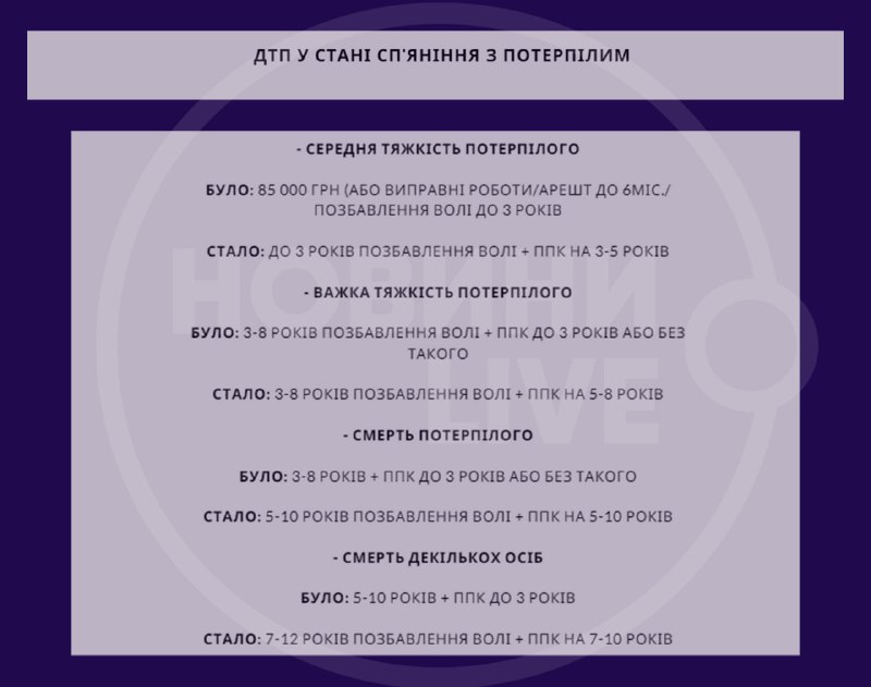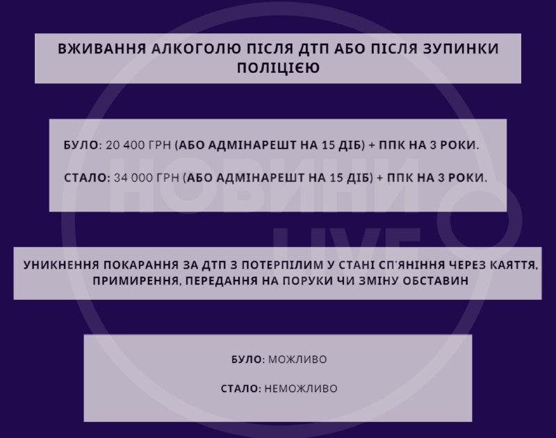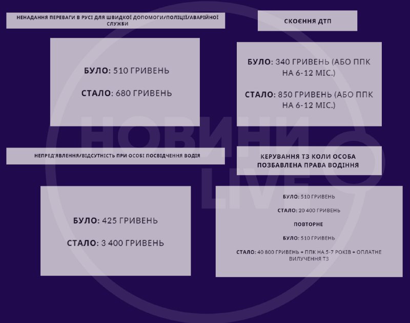 превышение скорости, что привело к созданию аварийной ситуации - 1 440 гривен (с возможностью лишения прав на 3-6 месяцев).
