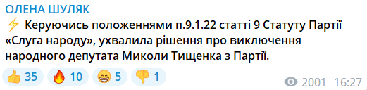 "Керуючись положеннями п.9.1.22 статті 9 Статуту Партії "Слуга народу", ухвалила рішення про виключення народного депутата Миколи Тищенка з Партії", — повідомила Шуляк.