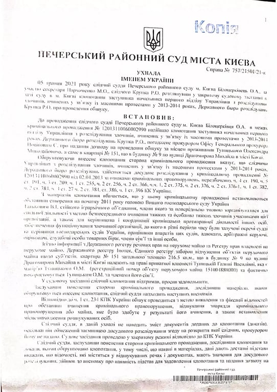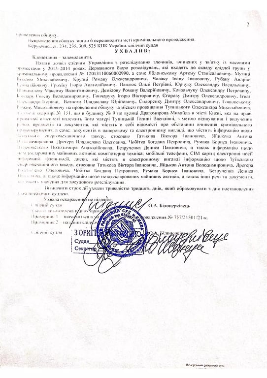 У документі не наводять зміст доказів, адже клопотання обмежене таємницею досудового розслідування. Судове засідання, де надали ухвалення на обшуки, відбулося у закритому режимі відвовідно до КПК України.