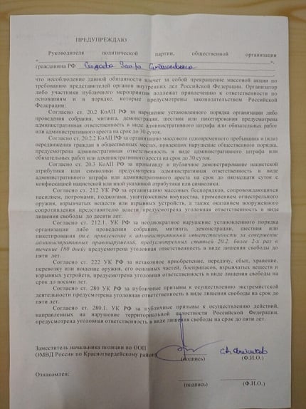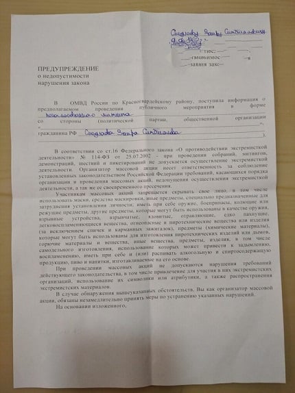 Відповідне застереження окупаційна "поліція" Криму, зокрема, вручила кримськотатарському активісту Заїру Смедляєву. У ньому також вазується, що на території Криму "планується проведення неузгодженого мітингу".