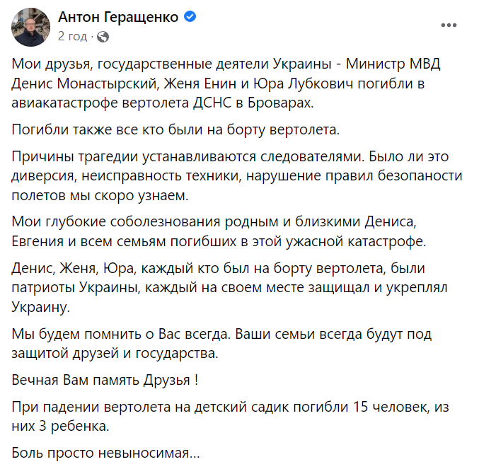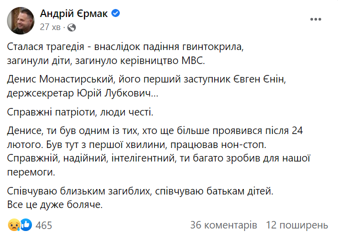 Terrible news on the deadly helicopter crash and the death of the Minister of Interior Denys Monastyrskyi and the leadership of the Ministry, we mourn victims on the ground, my deep condolences to the families and friends, I wish speedy recovery to the injured