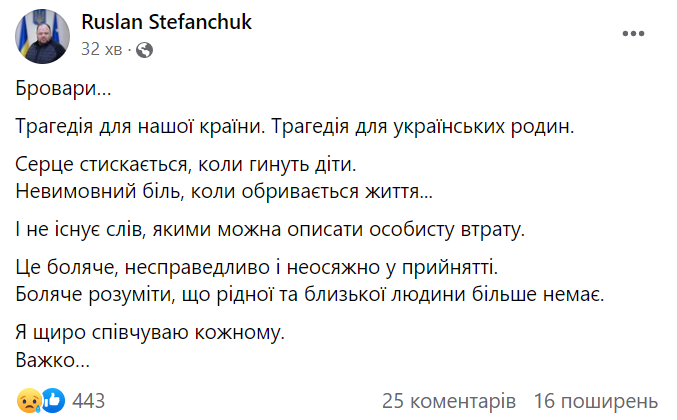 It is with deep sadness that I received information about the helicopter crash in Brovary near Kyiv which left several persons killed, including senior officials of Ukraine's Ministry of Interior. My thoughts are with the families and loved ones of the victims.